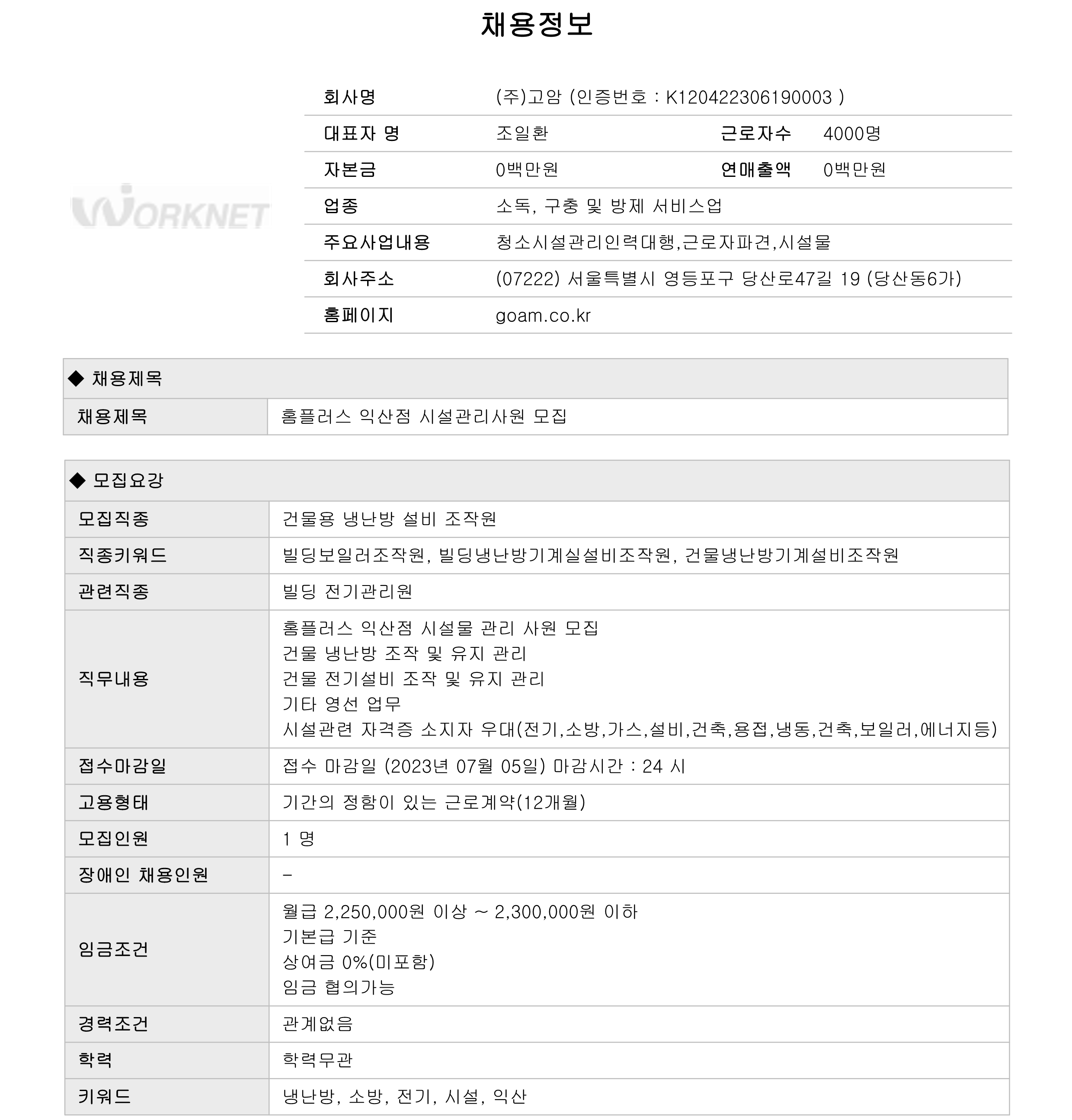 [(주)고암] 홈플러스 익산점 시설관리원 모집