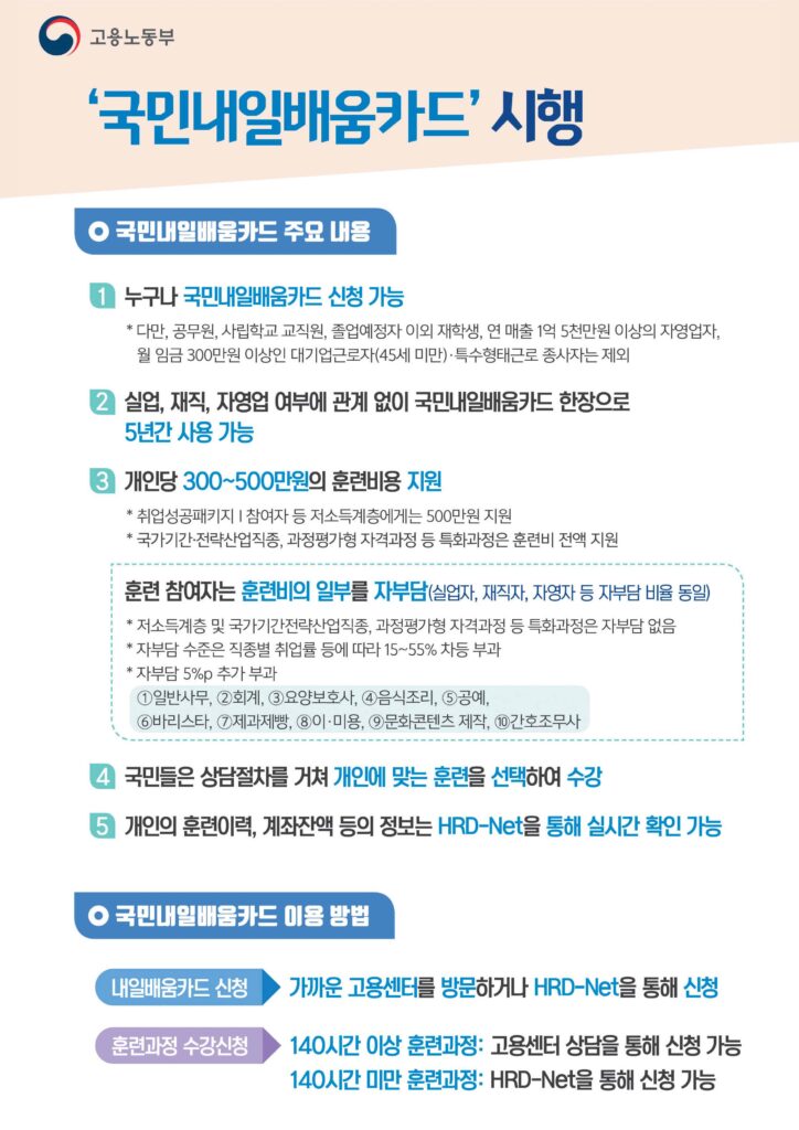산업구조 변화 등에 따라 지원이 필요한 산업의 재직자, 실업자 등의 고용유지 및 이·전직 등을 활성화하기 위한 현장 기반 훈련을 수시 공급하고 훈련비 및 훈련장려금 등 지원 / 훈련비용은 자비부담금 없이 1회에 한해 전액 훈련비 지원