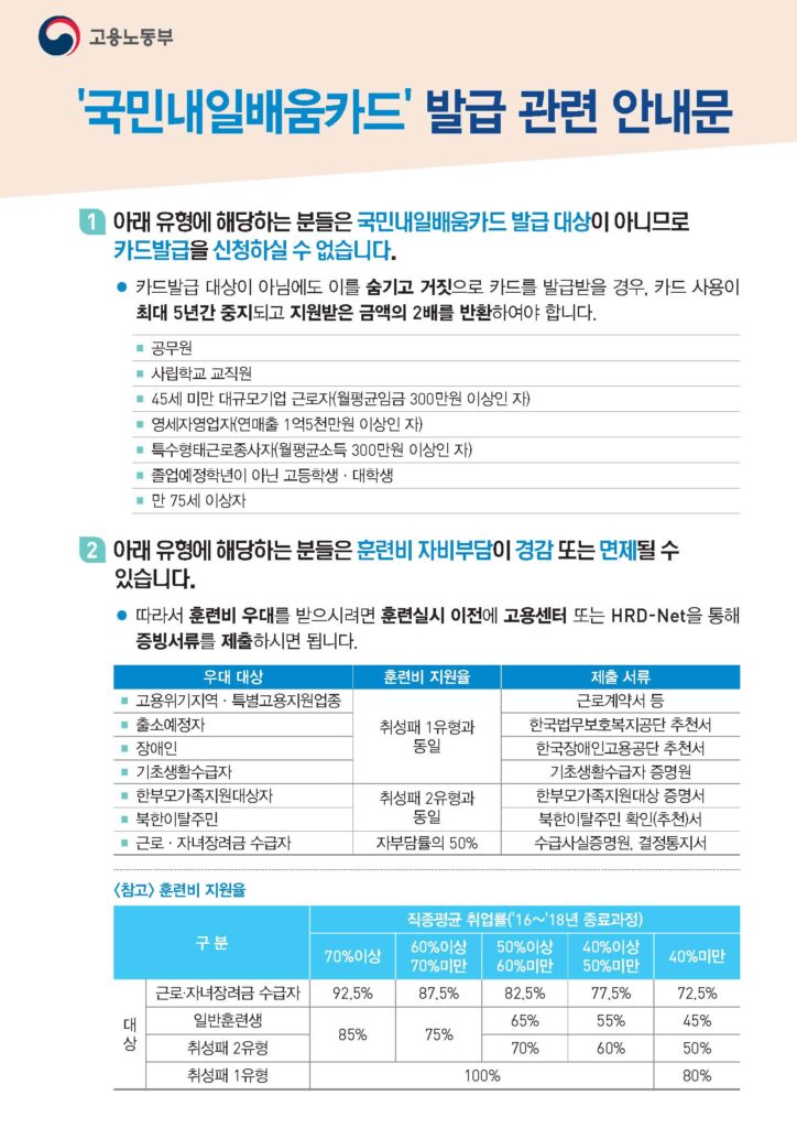 ② 훈련기관에서 인터넷 카드 발급 신청 또는 고용센터 현장 카드 발급 신청 (직업훈련 과정 등록 시 “국민내일배움카드”라는 명칭의 직업훈련 대상자 지원 카드 발급이 필요합니다.)