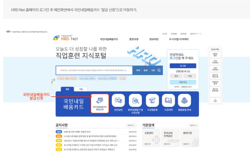 • hrd-net 직업훈련포털사이트 홈페이지 메인화면의 국민내일배움카드신청 버튼을 통해 접근하실 수 있습니다.